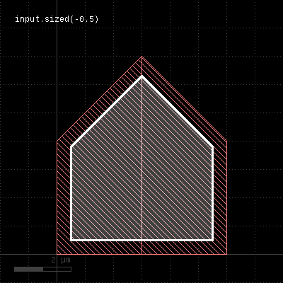 In KLayout's DRC language, a layer is an object that provides a couple of methods. The boolean operations are methods, the DRC functions are methods and so on. Method are called "on" an object using the notation "object.method(arguments)". Many methods produce new layer objects and other methods can be called on those. The following code creates a sized version of the input layer and outputs it. Two method calls are involved: one sized call on the input layer returning a new layer object and one output call on that object.