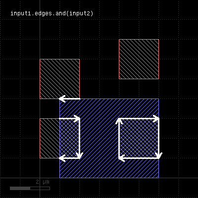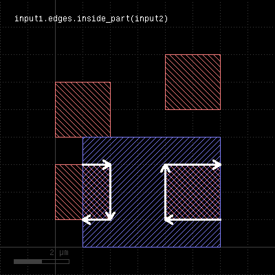This method returns the parts of the edges which are inside the given region. This is similar to the "&" operator, but this method does not return edges that are exactly on the boundaries of the polygons of the region. This method is available for edge layers. The argument must be a polygon layer.