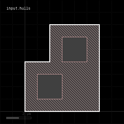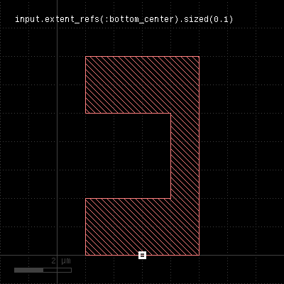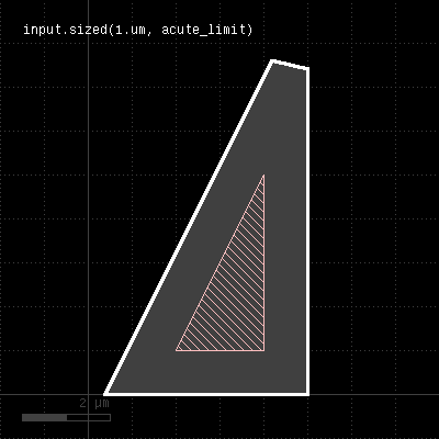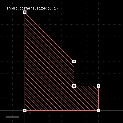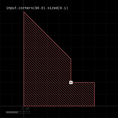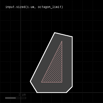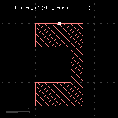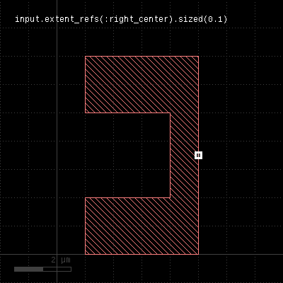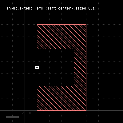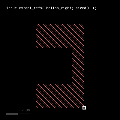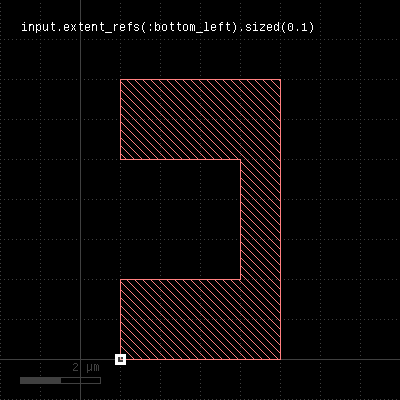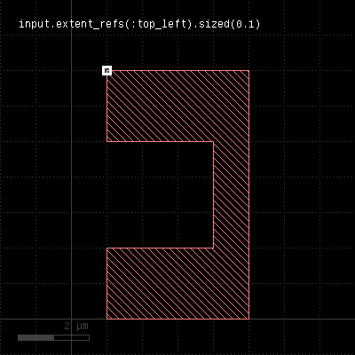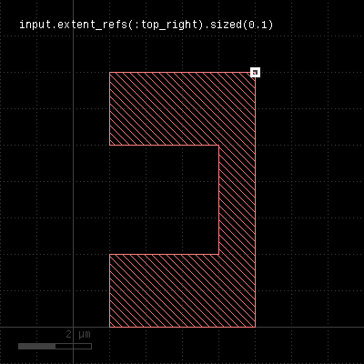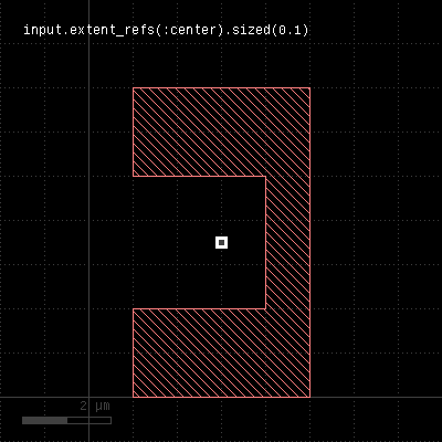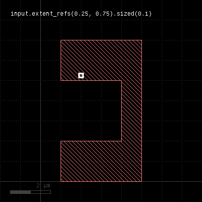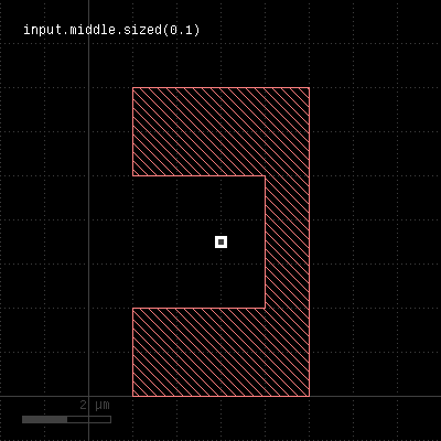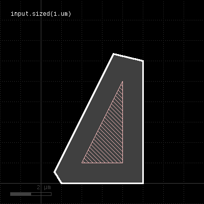 Merged semantics applies, i.e. polygons will be merged before the sizing is applied unless the layer was put into raw mode (see raw). On output, the polygons are not merged immediately, so it is possible to detect overlapping regions after a positive sizing using raw and merged with an overlap count, for example: layer.sized(300.nm).raw.merged(2) Bias values can be given as floating-point values (in micron) or integer values (in database units). To explicitly specify the unit, use the unit denominators. size is working like sized but modifies the layer it is called on. The following images show the effect of various forms of the "sized" method: