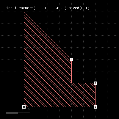 This method produces markers on the corners of the polygons. An angle criterion can be given which selects corners based on the angle of the connecting edges. Positive angles indicate a left turn while negative angles indicate a right turn. Since polygons are oriented clockwise, postive angles indicate concave corners while negative ones indicate convex corners. The markers generated can be point-like edges or small 2x2 DBU boxes. The latter is the default. The options available are: