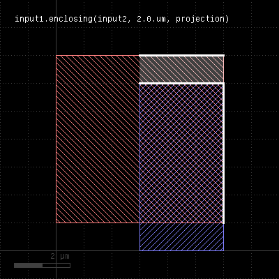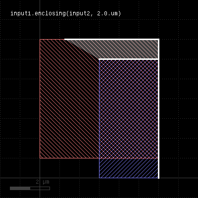 This method checks whether layer encloses (is bigger than) other_layer by the given dimension. Locations, where this is not the case will be reported in form of edge pair error markers. Locations, where both edges coincide will be reported as errors as well. Formally such locations form an enclosure with a distance of 0. Locations, where other_layer extends outside layer will not be reported as errors. Such regions can be detected by not_inside or a boolean "not" operation. The enclosing method can be applied to both edge or polygon layers. On edge layers the orientation of the edges matters and only edges looking into the same direction are checked. As for the other DRC methods, merged semantics applies. The options available are the same than for width. Distance values can be given as floating-point values (in micron) or integer values (in database units). To explicitly specify the unit, use the unit denominators. The following images show the effect of two enclosing checks (red: input1, blue: input2):