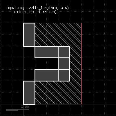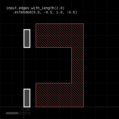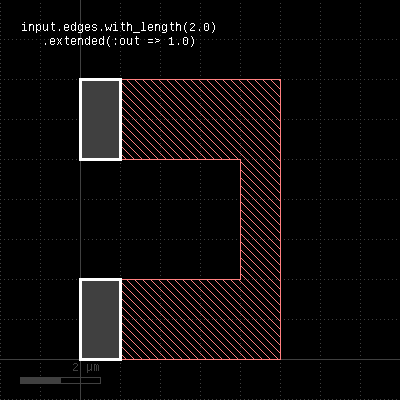 This method applies to edge layers only. Polygons are generated for each edge describing the edge drawn with a certain width extending into the "inside" (the right side when looking from start to end). This method is basically equivalent to the extended method: "extended(0, 0, 0, dist)". A version extending to the outside is extended_out. "extended_out" - Returns polygons describing an area along the edges of the inputUsage: