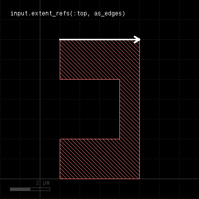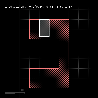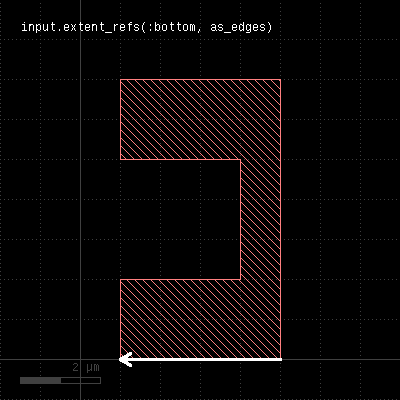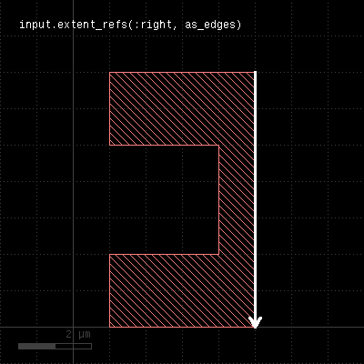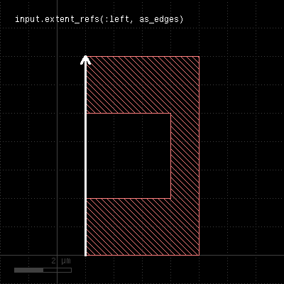 This method applies to edge layers only. Polygons are generated for each edge describing the edge drawn with a certain width extending into the "outside" (the left side when looking from start to end). This method is basically equivalent to the extended method: "extended(0, 0, dist, 0)". A version extending to the inside is extended_in. "extent_refs" - Returns partial references to the boundings boxes of the polygonsUsage: