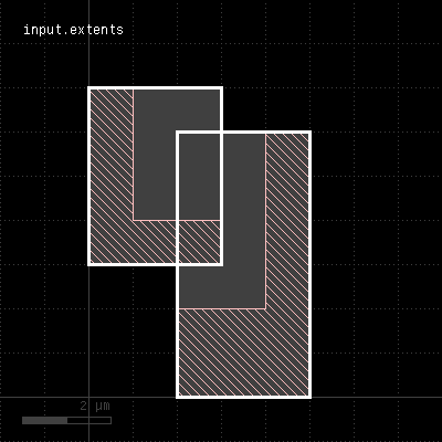 Applies to edge layers, polygon layers on edge pair collections. Returns a polygon layer consisting of boxes for each input object. The boxes enclose the original object. Merged semantics applies, so the box encloses the merged polygons or edges unless raw mode is chosen (see raw). The enlargement parameter specifies an optional enlargement which will make zero width/zero height object render valid polygons (i.e. horizontal/vertical edges). The following images show the effect of the extents method: