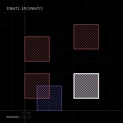 This method selects all shapes or regions from self which are contained the other region exactly. It will use individual shapes from self or other if the respective region is in raw mode. If not, it will use coherent regions or combined edges from self or other. It will return a new layer containing the selected shapes. A method which selects all shapes not contained in the other layer is not_in. This method is available for polygon and edge layers. The following image shows the effect of the "in" method (input1: red, input2: blue):