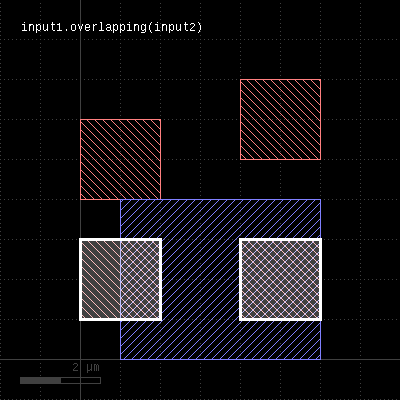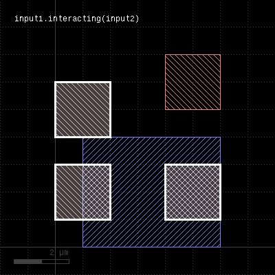 This method selects all shapes or regions from self which touch or overlap shapes from the other region. If self is in raw mode (see raw), coherent regions are selected from self, otherwise individual shapes are selected. It returns a new layer containing the selected shapes. A version which modifies self is select_interacting. This method is available for polygon and edge layers. Edges can be selected with respect to other edges or polygons. The following image shows the effect of the "interacting" method (input1: red, input2: blue):