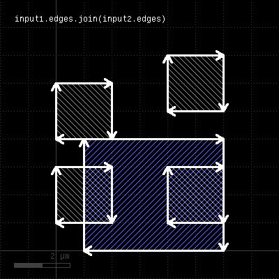 The method includes the edges or polygons from the other layer into this layer. It is an alias for the "+" operator. This method is available for polygon, edge and edge pair layers. The following images show the effect of the "join" method on polygons and egdes (layer1: red, layer2: blue):