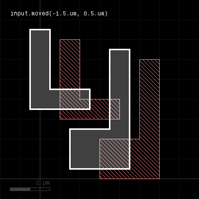 Moves the input layer by the given distance (x, y) and returns the moved layer. The layer that this method is called upon is not modified. Shift distances can be given as floating-point values (in micron) or integer values (in database units). To explicitly specify the unit, use the unit denominators. The following images shows the effect of the "moved" method: