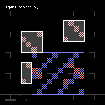 The method includes the edges or polygons from the other layer into this layer. The "+" operator is an alias for the join method. This method is available for polygon, edge and edge pair layers. An alias is "join". See there for a description of the function. "-" - Boolean NOT operationUsage: