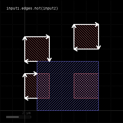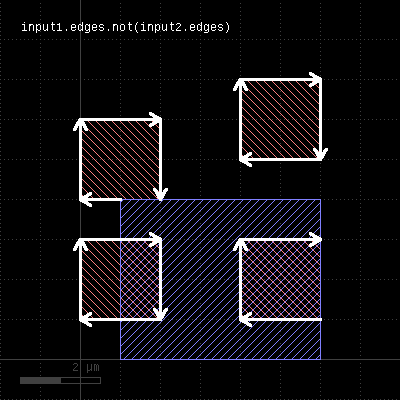 This method returns the parts of the edges which are outside the given region. This is similar to the "&" operator, but this method does not remove edges that are exactly on the boundaries of the polygons of the region. This method is available for edge layers. The argument must be a polygon layer.
