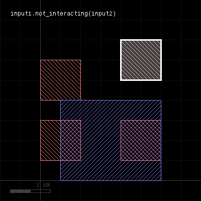 This method selects all shapes or regions from self which do not touch or overlap shapes from the other region. If self is in raw mode (see raw), coherent regions are selected from self, otherwise individual shapes are selected. It returns a new layer containing the selected shapes. A version which modifies self is select_not_interacting. This method is available for polygon and edge layers. Edges can be selected with respect to other edges or polygons. The following image shows the effect of the "not_interacting" method (input1: red, input2: blue):