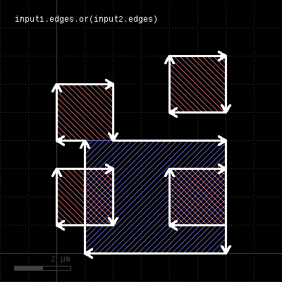 The method computes a boolean OR between self and other. It is an alias for the "|" operator. This method is available for polygon and edge layers. The following images show the effect of the "or" method on polygons and egdes (layer1: red, layer2: blue):