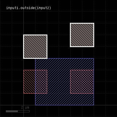 This method selects all shapes or regions from self which are completely outside the other region (no part of these shapes or regions may be covered by shapes from the other region). If self is in raw mode, this method will select individual shapes. Otherwise, this method will select coherent regions and no part of these regions may overlap with shapes from the other region. It returns a new layer containing the selected shapes. A version which modifies self is select_outside. This method is available for polygon layers. The following image shows the effect of the "outside" method (input1: red, input2: blue):