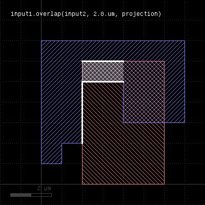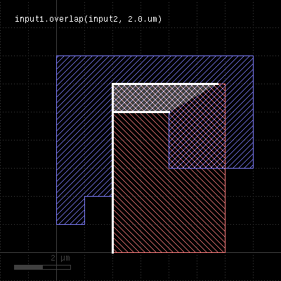 This method checks whether layer and other_layer overlap by at least the given length. Locations, where this is not the case will be reported in form of edge pair error markers. Locations, where both layers touch will be reported as errors as well. Formally such locations form an overlap with a value of 0. Locations, where both regions do not overlap or touch will not be reported. Such regions can be detected with outside or by a boolean "not". Formally, the overlap method is a two-layer width check. In contrast to the single- layer width method (width), the zero value also triggers an error and separate polygons are checked against each other, while for the single-layer width, only single polygons are considered. The overlap method can be applied to both edge or polygon layers. On edge layers the orientation of the edges matters: only edges which run back to back with their inside side pointing towards each other are checked for distance. As for the other DRC methods, merged semantics applies. The options available are the same than for width. Distance values can be given as floating-point values (in micron) or integer values (in database units). To explicitly specify the unit, use the unit denominators. The following images show the effect of the overlap check (layer1: red, layer2: blue):