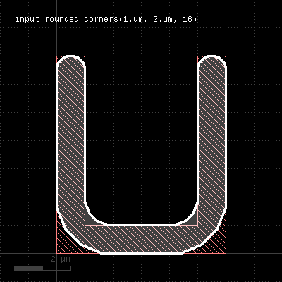 Inner (concave) corners are replaced by circle segments with a radius given by the "inner" parameter. Outer (convex) corners are relaced by circle segments with a radius given by the "outer" parameter. The circles are approximated by polygons. "n" segments are used to approximate a full circle. This method return a layer wit the modified polygons. Merged semantics applies for this method (see raw and clean). If used with tiling, the rounded_corners function may render invalid results because in tiling mode, not the whole merged region may be captured. In that case, inner edges may appear as outer ones and their corners will receive rounding. The following image shows the effect of the "rounded_corners" method. The upper ends of the vertical bars are rounded with a smaller radius automatically because their width does not allow a larger radius.