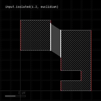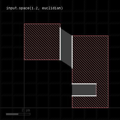 This method performs a space check and returns a collection of edge pairs. A space check can be performed on polygon and edge layers. On edge layers, all edges are checked against all other edges. If two edges form a "face to face" relation (i.e. their outer sides face each other) and their distance is less than the specified value, an error shape is generated for that edge pair. On polygon layers, the polygons on each layer are checked for space against other polygons for locations where their space is less than the specified value. In that case, an edge pair error shape is generated. The space check will also check the polygons for space violations against themselves, i.e. notches violating the space condition are reported. The notch method is similar, but will only report self-space violations. The isolated method will only report space violations to other polygons. separation is a two-layer space check where space is checked against polygons of another layer. The options available are the same than for the width method. Like for the width method, merged semantics applies. Distance values can be given as floating-point values (in micron) or integer values (in database units). To explicitly specify the unit, use the unit denominators. The following image shows the effect of the space check: