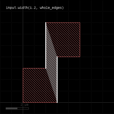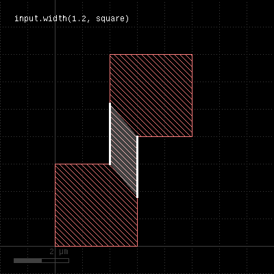 Note that without the angle_limit, acute corners will always be reported, since two connected edges always violate the width in the corner. By adjusting the angle_limit, an acute corner check can be implemented. Merge semantics applies to this method, i.e. disconnected polygons are merged before the width is checked unless "raw" mode is chosen. The resulting edge pairs can be converted to polygons using the polygons method. Distance values can be given as floating-point values (in micron) or integer values (in database units). To explicitly specify the unit, use the unit denominators, i.e. # width check for 1.5 micron: markers = in.width(1.5) # width check for 2 database units: markers = in.width(2) # width check for 2 micron: markers = in.width(2.um) # width check for 20 nanometers: markers = in.width(20.nm) The following images show the effect of various forms of the width check: