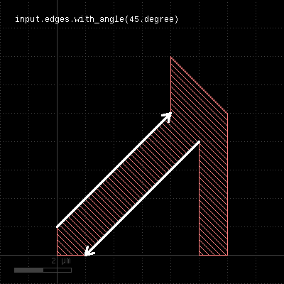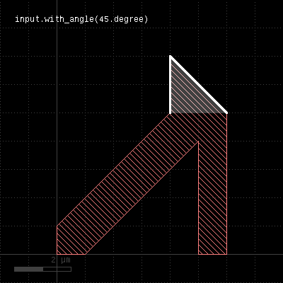 When called on an edge layer, the method selects edges by their angle, measured against the horizontal axis in the mathematical sense. The first version selects edges with a angle larger or equal to min and less than max (but not equal). The second version selects edges with exactly the given angle. The third version is identical to the first one. When called on a polygon layer, this method selects corners which match the given angle or is within the given angle interval. The angle is measured between the edges forming the corner. For each corner, an edge pair containing the edges forming in the angle is returned. A method delivering all objects not matching the angle criterion is without_angle. The following images demonstrate some use cases of with_angle and without_angle: