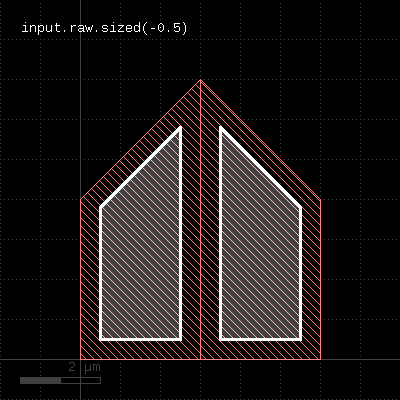 In KLayout's DRC language, a layer is an object that provides a couple of methods. The boolean operations are methods, the DRC functions are methods and so on. Method are called "on" an object using the notation "object.method(arguments)". Many methods produce new layer objects and other methods can be called on those. The following code creates a sized version of the input layer and outputs it. Two method calls are involved: one sized call on the input layer returning a new layer object and one output call on that object.