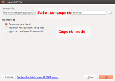 KLayout supports import of LEF and DEF files. Because LEF and DEF import is substantially different from a single-file reader, this functionality is wrapped in an import feature rather than a standard file format reader. For example, reading a DEF file without accessing the library LEF files does not make much sense. Therefore the import feature requires additional information beyond the simple file name, specifically the list of LEF files to load additionally and the order in which to do so.