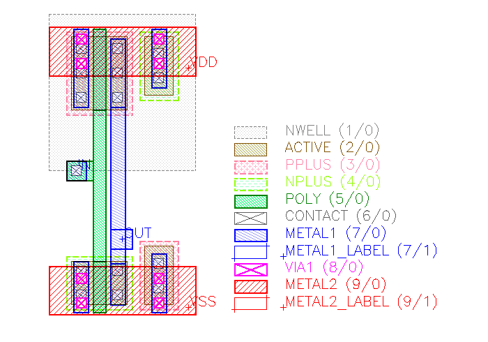 The inverter consists of two MOS transistors. A single transistor is made from an active region (a rectangle on the ACTIVE layer) and a gate (POLY layer) crossing the active region. The gate forms the channel from source to drain regions (left and right of gate). Contacts (CONTACT) provide connections from the first metal layer (METAL1) to the gate polysilicon (POLY) and to source/drain regions (where over ACTIVE). Via holes (VIA1) provide connections from the first (METAL1) to the second metal (METAL2). Finally, specific devices are formed by the source/drain implants which is n+ (NPLUS marker) for NMOS and p+ (PPLUS marker) for PMOS devices. PMOS devices sit in a n implant region (n-well) which forms the p-channel region. NMOS devices are built over substrate which is p doped to supply the n-channel region.
