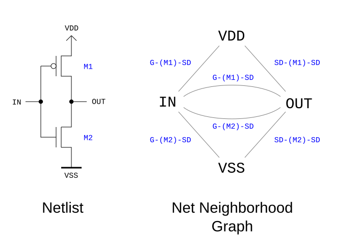 Here the IN net's neighborhood is VDD via a traversal of gate to source/drain over M1, to OUT via a twofold traversal of gate to source/drain over M1 and M2 and to VSS via another single traversal of gate to source/drain over M2. This uniquely identifies IN in this simple circuit. In effect, OUT, VDD and VSS can be identified uniquely because their transitions from the IN net are unambigously identifying them. The topological neighborhood is a simple metrics which allows identifying matching nets from two netlists and deducing further relations.