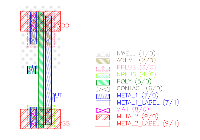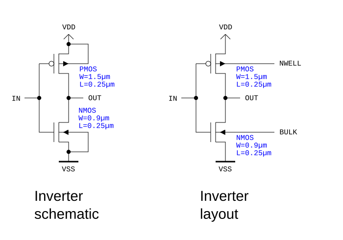 On the inverter level however, there is no such connection. Therefore the inverter has separate bulk and n-well pins. The schematic sometimes is a simplified version which does not offer these pins. Hence there is an intrinsic mismatch between layout and schematic.