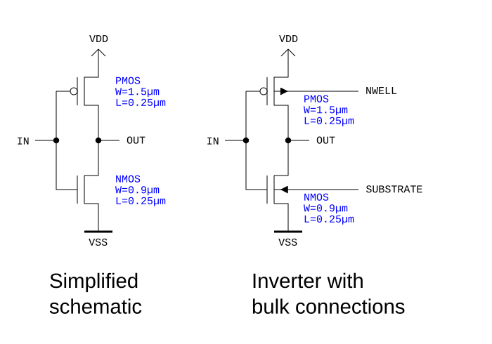 For the inverter we can draw a schematic in a simplified form (left) and in a more realistic form (right) which also includes the bulk potentials of the transistors. It is important to keep the bulk of of the transistors at a defined potential to avoid latch-up. Hence we need pins for these terminals too. This makes a total of six pins: for input (IN) and output (OUT), for the power (VDD, VSS) and the two bulk potentials (NWELL, SUBSTRATE):