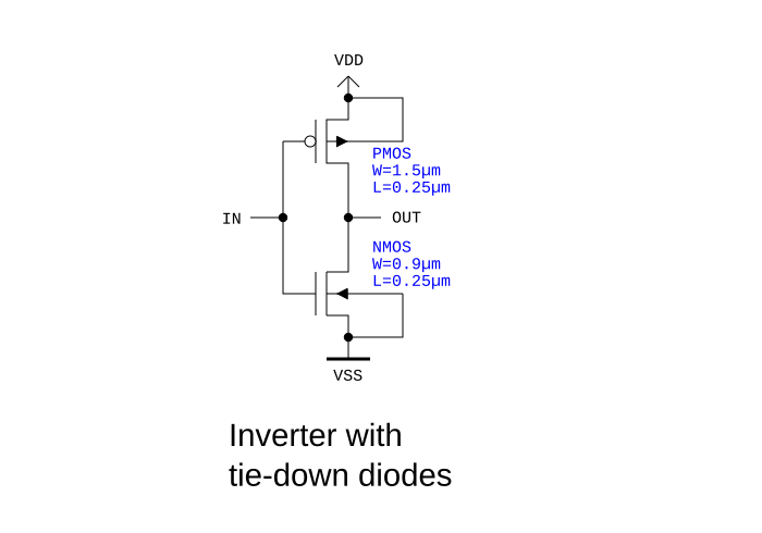 The inverter cell above is not useful by itself as it lacks features to tie the n well and the substrate to a defined potential. This is achieved with tie-down diodes.